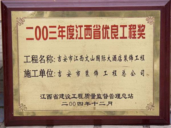 2004年,文山建设工程有限公司(原吉安市装饰工程总公司)承接项目“江西文山国际大酒店装饰 工程”荣获2003年度江西省优良工程奖